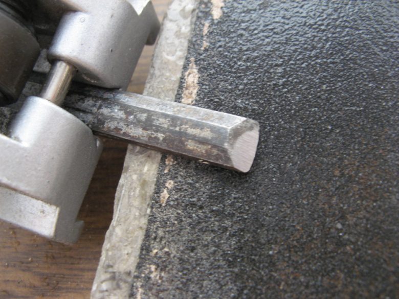 העבודה כאן החלה עם נייר לטש מס’ 80, כיוון שהיה צורך להוריד הרבה חומר. זה נייר גס ביותר שאין להשתמש בו בהשחזה רגילה. להמחשת מצב הלהב המקורי וחוסר הסימטריה אליה הגיע, ראו היכן ירד חומר (והיכן לא ירד) בעת השחזה תוך שימוש במוביל: