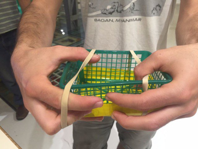 קיפול מגש הניקוז וחיבורו לסלסלה בעזרת גומיות