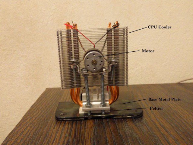 מניחים על הבסיס את ה-Peltier, ומניחים על ה-Peltier את זרועות הקירור ומחברים לבסיס עם ברגים ואומים. החלק הכי קשה בכל הבניה היה למצוא בסיס יציב למנוע שיהיה חלק מהמבנה. אני השתמשתי בברגים ארוכים שמחזיקים שתי פיסות מתכת שעוטפות את המנוע.