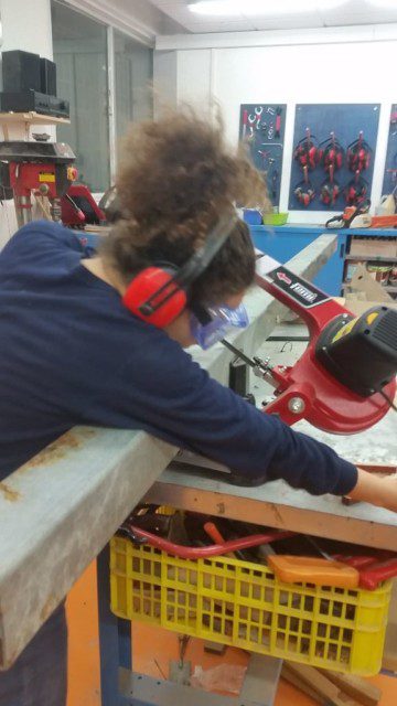 יערה המתנדבת המקסימה חותכת את הפרופיל 10x10 במסור הסרט