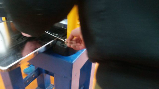 במקרה שלנו, אחרי שלוש קושרות היה נראה שהשולחן התפתל מעט בסיבוב, והיה צריך לקרב שתי רגליים נגדיות כדי לתת לחץ זמני לישור עד שהריתוך יסתיים. את זה עשינו עם שתי חתיכות עץ שאיפשרו לאחוז את הפינה של הפרופיל עם קליבה רגילה.