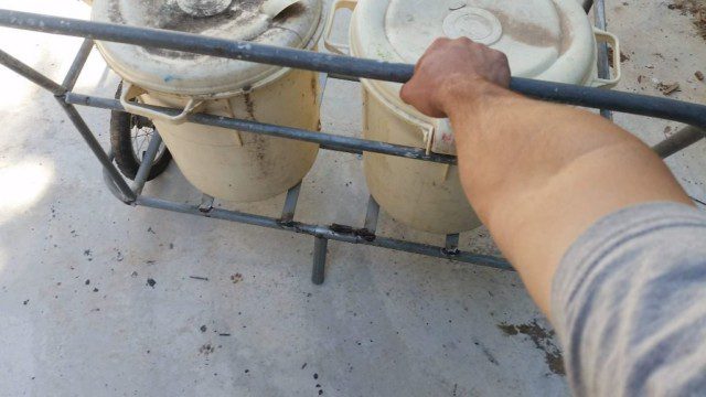 בשלב זה עשיתי סיבוב עם העגלה ועליה פח אחד, והוא לא נגמר בטוב. היה קשה לשמור על איזון בלי ידית בגובה הבטן ודופן קדמית לעגלה (עליהן נדבר עוד מעט), וקשה להניח את העגלה בלי רגלית שדואגת שלא הכל יתהפך.