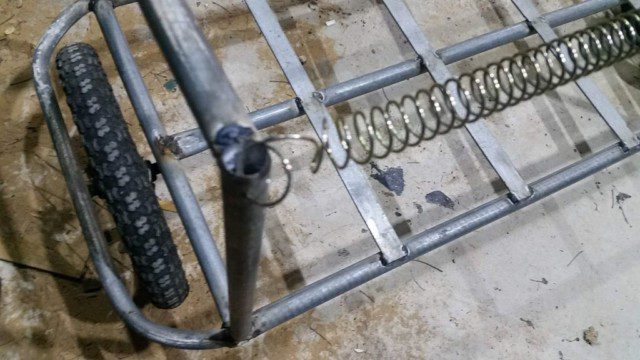 היו כל מיני מחשבות, כשבסוף נסגרתי על קפיץ מתיחה חזק, שניתן לסגור אותו באלכסון למקרה שיש מעט פחים או כדופן ישרה במקרה שיש עגלה מלאה.