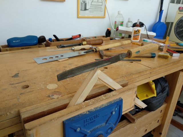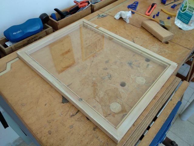 בתמונה האחרונה הכנת החריץ השקוע לזיגוג. הכלי הנראה כאן הוא מקצועת חריצים בת כ- 80 שנה, וכן – היא מיועדת רק לימניים. מי שאין לו מקצועת חריצים ועובד עם כלים ידניים – יכול לנסות עם משרט, מסור ומפסלת. זה מה שעשתי בפוסט הקודם במסגרת קטנה יותר. מי שמנגר בכלים חשמליים – טרימר יעשה את העבודה.
