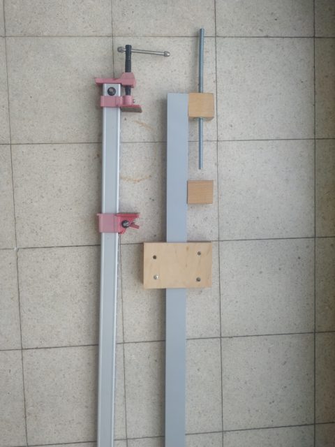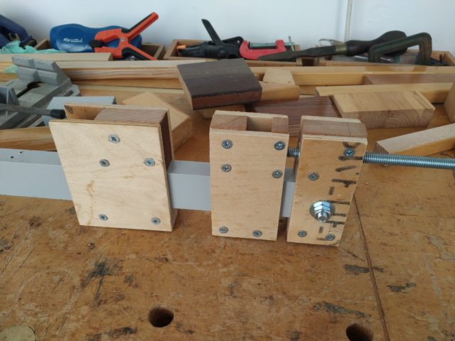 התוצאה רחבה מרוחב השידרה ותחייב מעט עבודת נגרות בהמשך. בינתיים בתמונה האחרונה עוד ניסיון – לחי קבועה צרה יותר ברוחב 2 ס”מ, כרוחב השידרה. מוט ההברגה בקוטר “3/8 (9.5 מ”מ) כנראה מפירוק תקרה אקוסטית, הגיע עם אום ננעץ שחלקו החיצוני מחוספס, וכרגע זה תופס.