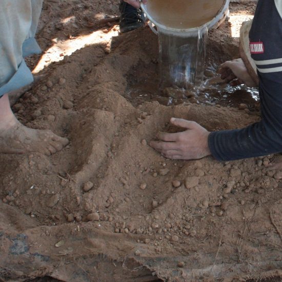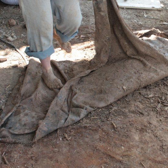 נערבב את החומרים ברגלינו היחפות על היריעה תחילה ללא מים, כיוון שאחרי הוספת המים התערובת הופכת להיות כבדה, ועל כן כל ערבוב על יבש יקל עלינו בהמשך.