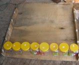 בשלב הבא ווידאתי שאורך המדפים שנוצר במתקן מתאים לרוחב הדיקט שיש לי, ולצפיפות קופסאות רצויה. לשם כך, הנחתי את הדיקט על הרצפה, העמדתי את שני קירות המתקן על הדיקט כאילו הן מחוברות, והעמדתי קופסאות לכל האורך. כך הייתי בטוח שלא יישאר סתם רווח של חצי קופסא בכל שורה.