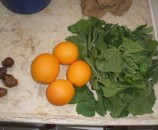במתכון המדובר תמצאו 3-4 תפוזים (די קטנים) מהעץ שליד המטבח (עץ מדהים שלא מקבל מים שפירים כלל, רק מי גשם כשישנם, וכנראה השורשים שלו התחברו לאיזו דליפה של צינור ביוב או משהו בסגנון), בערך עשרה עלים של כובע הנזיר, ארבעים עלי חובזה, שני עלי חרדל (הם חריפים ממש, אז שניים מספיקים) וארבעת התמרים שדיברנו עליהם קודם.