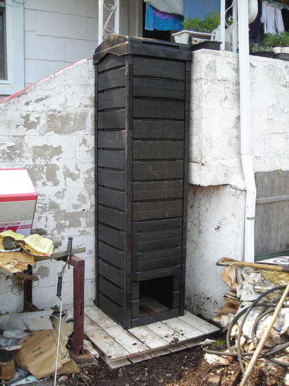 הקומפוסטרים הקלאסים של ה”עשה זאת בעצמך” – קובייה מעץ בכל מיני ווריאציות – הם העדיפים עלי. הנה אחד כזה שמאפשר הוספה של לוחות ככל שהוא מתמלא.