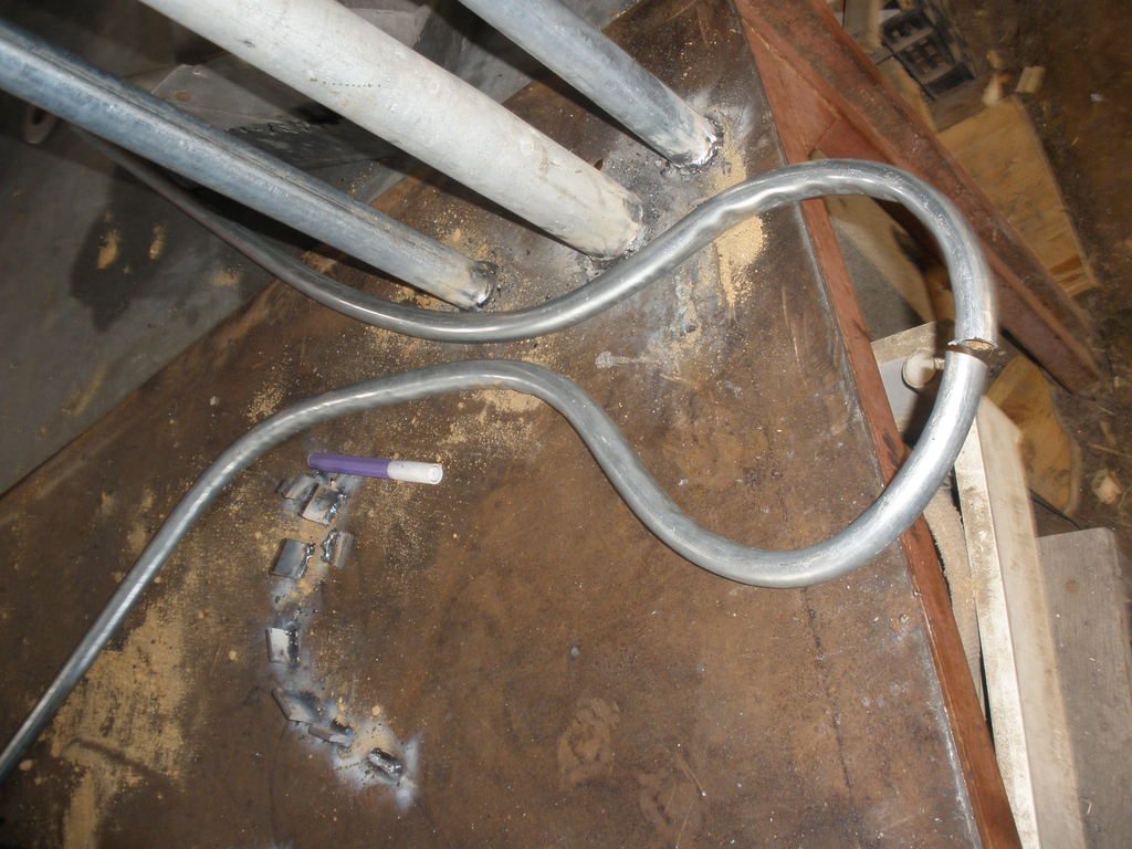 אחרי שכופפתי את שני החצאים של המושב האחורי הדקיק, הגיע הזמן לרתך. על מנת להגדיל את האחיזה של צינור בצינור בנקודות בהן היו חיבורים T, מעכתי עם פטיש את קצות הצינורות. (מצטער, אין לי תמונה של העניין).