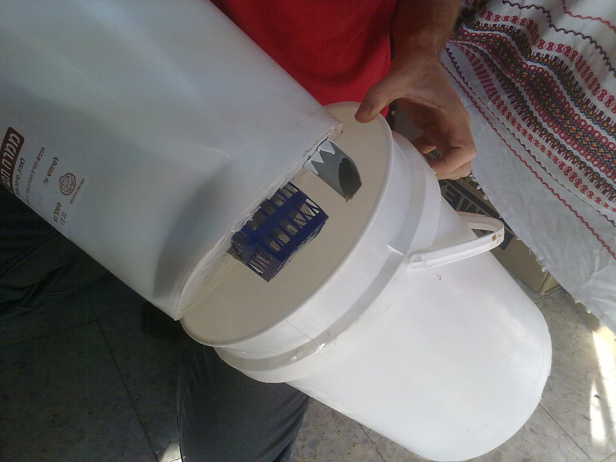 נקבו חורים בתחתית המיכל, סביב כל ההיקף, בחמשת הס”מ התחתונים שלו.