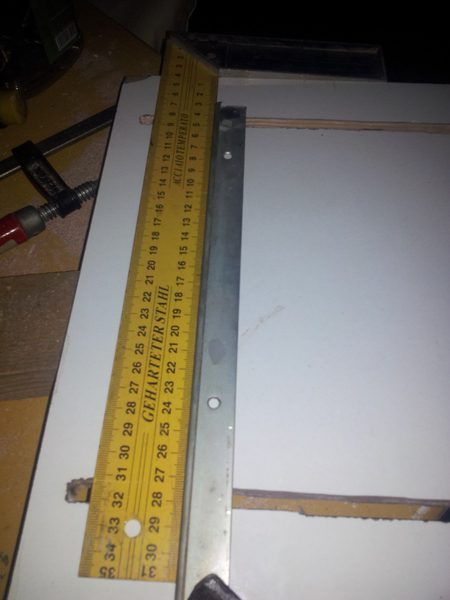 חשוב שהמסילות יהיו ישרות ומקבילות זה לזה, כדי שנוכל לזוז בתוכן בחופשיות ושהפלאח אליו מחוברת הסכין יישאר ישר. לכן, סימנתי בסרגל את הקווים המקבילים, קדחתי חור בעובי המסילה בקצה כל אחד משני הקווים (1 ס”מ, במקרה של עובי הבורג