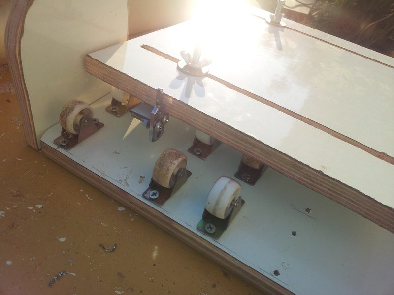 הסטופר הוא חתיכה מאותו חומר, דיקט מצופה פורמייקה, שיחזיק את תחתית הבקבוק במקום, ולא ייתן לה לברוח אחורה. את הסטופר חיברתי עם ברגים ארוכים לדיקט השוכב הגדול של החלק הסטטי.