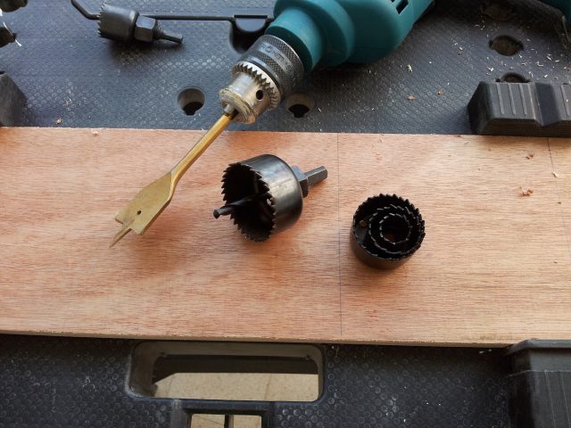 חזרתי למקדח הפרפר. כיוון שקוטר המקדח בארגז הכלים היה 30 מ”מ ואילו המומחים המליצו על 28 מ”מ, קדחתי ראשית חור רדוד במקדח הפרפר הקיים, ובהמשך השלמתי את הקידוח לכל עומקו במקדח כוס 28 מ”מ: