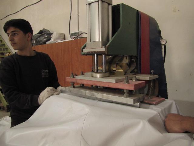 כעת נחבר את היריעות. יש קושי בתפירת כיסוי כזה גדול וכבד במכונת תפירה ביתית. בד עבה ניתן לתפור במכונת תפירה תעשייתית, כשיריעות שימשונים כדאי להלחים במקום המכין כיסויים. אנחנו ביקשנו להשאיר את החלק התחתון וגם 20 ס”מ במרכז (להכנסת כונס האוויר), ובמפעל ראינו אפשרות להוספת חלון בתוספת עלות.