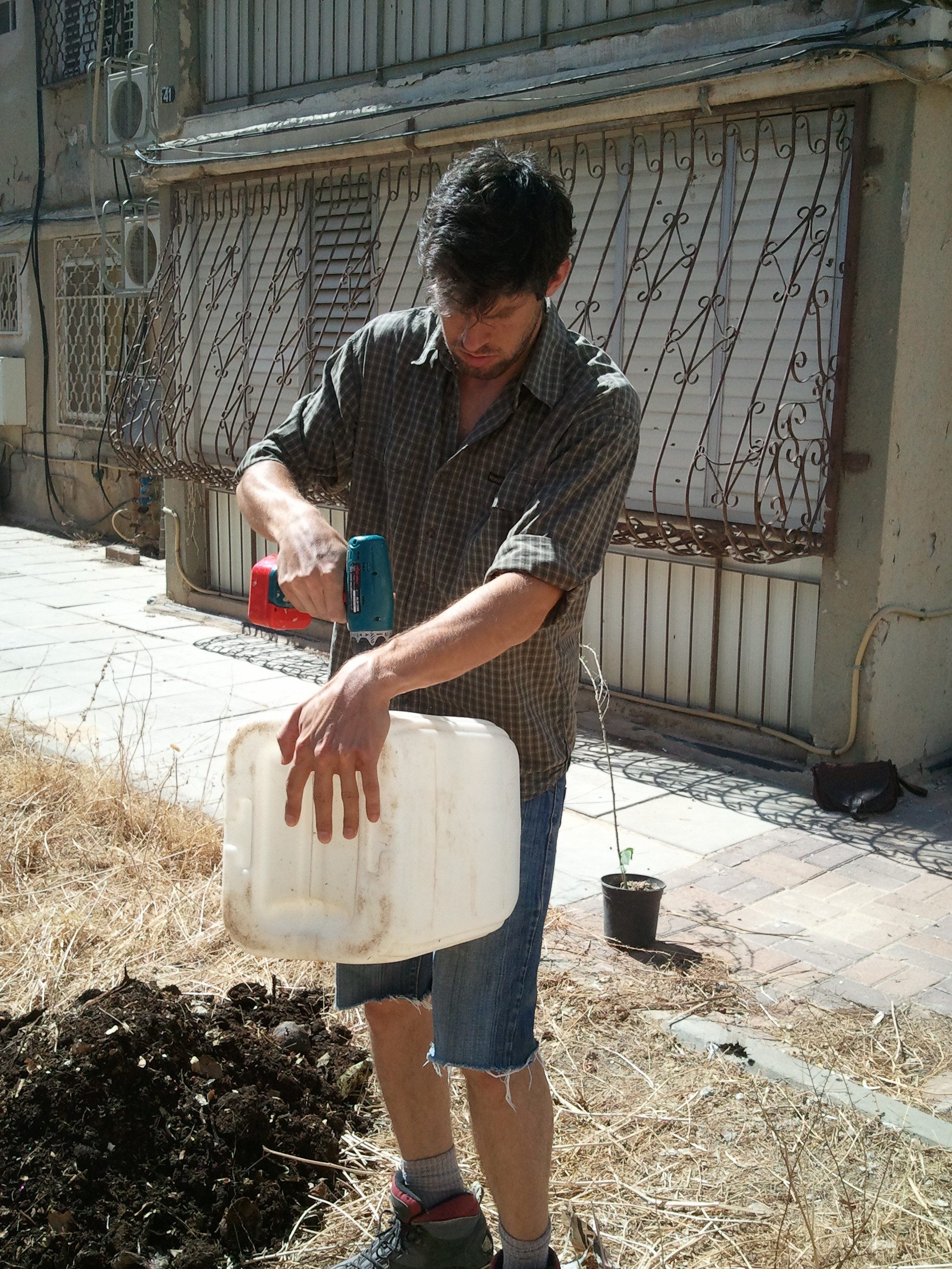 לרוב הבניינים בשכונה אין מערכת השקייה פועלת שניתן להתחבר אליה ולהשקות קבוע את העץ לכן יש למצא דרך אחרת להשקות ביעילות. את השיטה הזו למדתי כשהייתי בכיתה ד’, כשגיננו את “הגבעה הפורחת” כשעוד היו שיעורי טבע וכשעוד לא היה מקובל ל”אמץ אתר” מטעם משרד החינוך. זה היה חלק מטכניקות שימור מים שהשתמשנו בהם. והרי היא לפניכם.