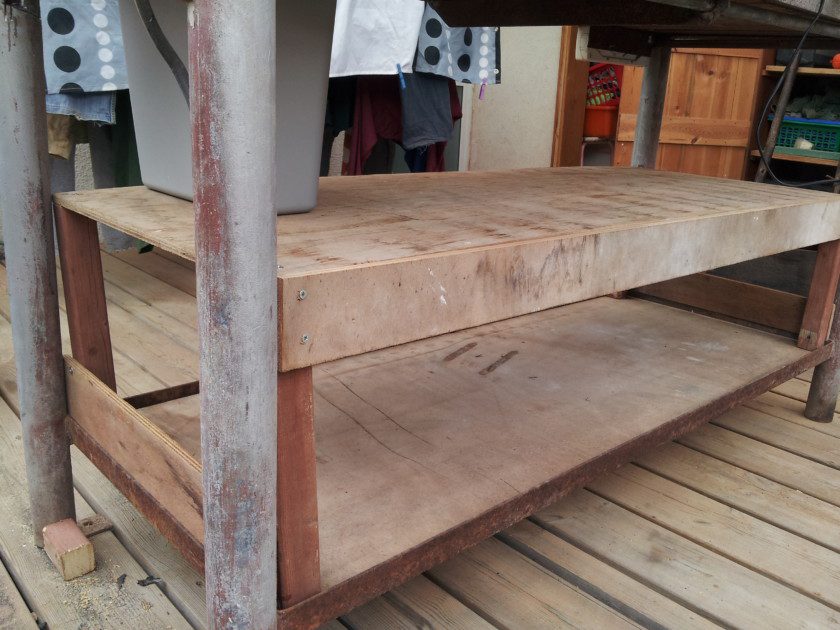 כיון שניתן היה להכניס מדף נוסף, וכיון שאין לי כישורי ריתוך, בניתי מעין שולחן עץ קטן שהתיישב על גבי המדף התחתון ויצר מדף נוסף.