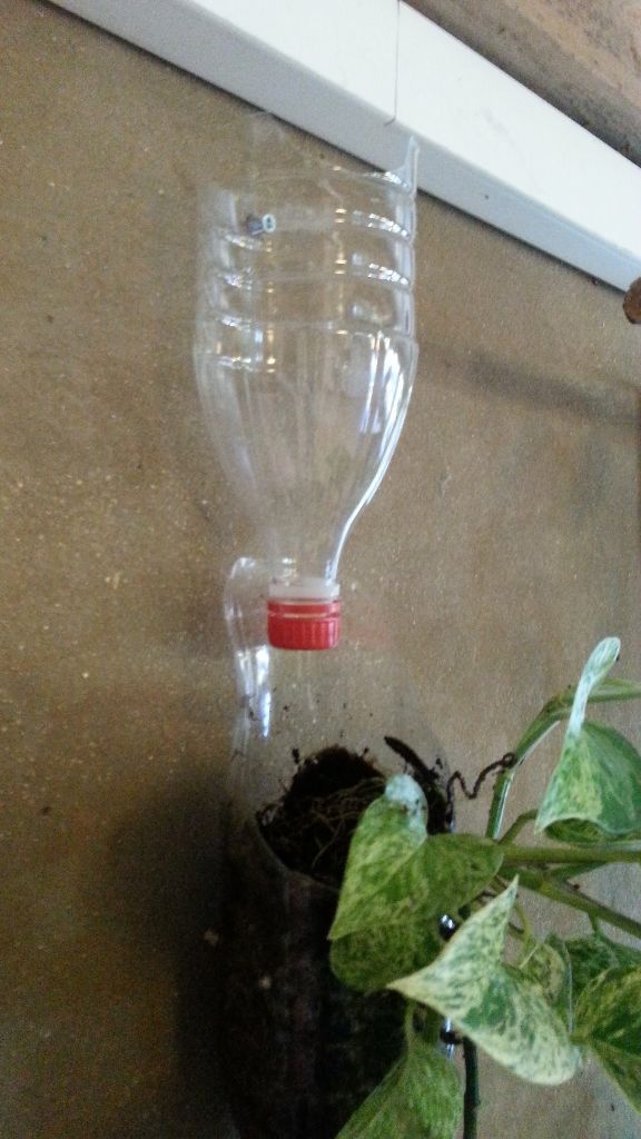 בקבוק השקיה: עושים חיתוך ישר באמצע הבקבוק, עושים חור עם מנקב ומולו בדיוק חותכים מעין מפרץ שיאפשר השקיה נוחה וגם יאפשר הברגה לתוך הקיר. את הפקק שלו ניתן להשאיר כמו שהוא ולפתוח אותו מעט, כדי לאפשר טפטוף איטי