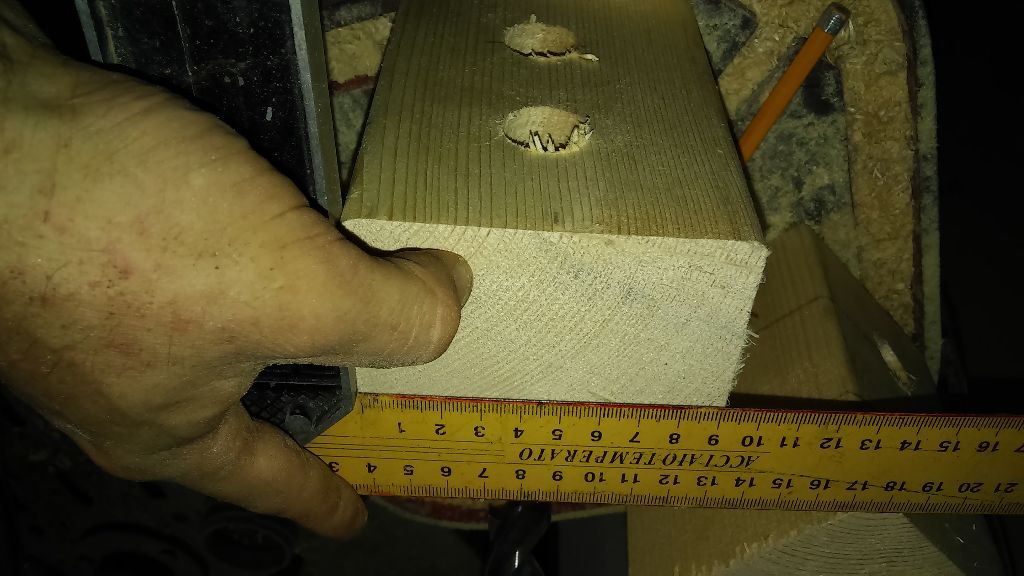 קחו בחשבון מראש שיהיה מאוד קשה לקדוח מעל 1000(!) חורים בלי מקדחת עמוד טובה. הקדיחה בעץ אורן לבן שכזה היא קלה סה”כ, אך גם מלוכלכת ומשאירה קצוות אותם יש לנקות מאוחר יותר בשלב הליטוש לקראת הצביעה. עומק של כל חור היה 3.5 ס”מ מכל כיוון. החלטתי שלא לחדור את כל העץ עד הצד השני כי לא רציתי שהמחברים יתקעו בפנים או לחילופין יפלו לצד שני (ראו: מחברים)