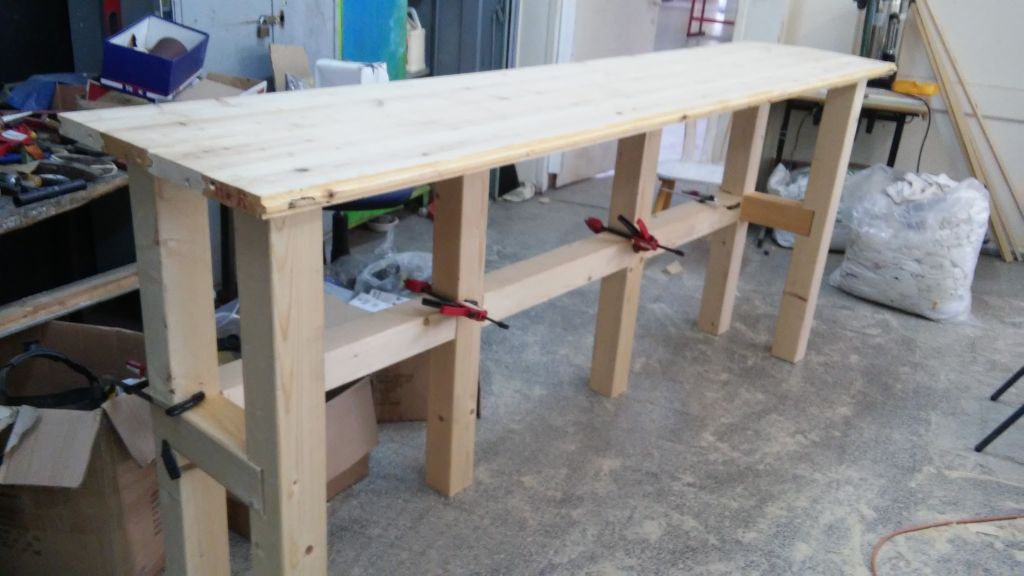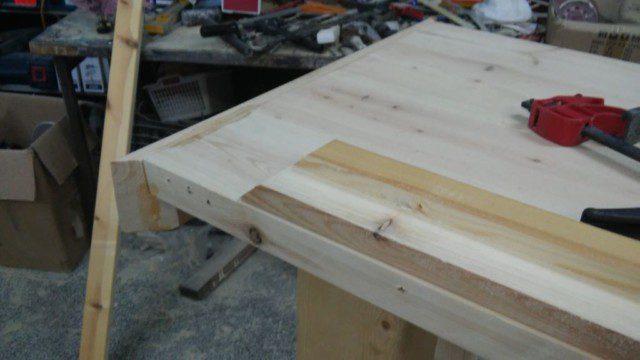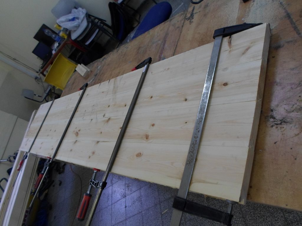 מאוד קשה ויקר למצוא משטח מעץ מלא ברוחב 50 ס”מ ובאורך 250 ס”מ. במקרים כאלו יש צורך בהדבקה. הטריק היה להשתמש בקורות עץ גלריה בעובי 4 ס”מ ורוחב 12 ס”מ שנחתכו לאורך של 250 ס”מ, ולהדביק 4 כאלו ביחד (שיחד עם הקאנט העבה אף יעברו יחד את ה50 ס”מ רוחב הרצויים). דבק הנגרים נמרח ביד נדיבה על בין חיבורי הזכר והנקבה של כל אחד מהשלבים, וכל המשטח נקלב ביחד עם קליבות ארוכות, כשקליבות קצרות הצמידו את המשטח לשולחן כדי שלא “יקבל בטן” מהלחץ שמופעל על הקורות.