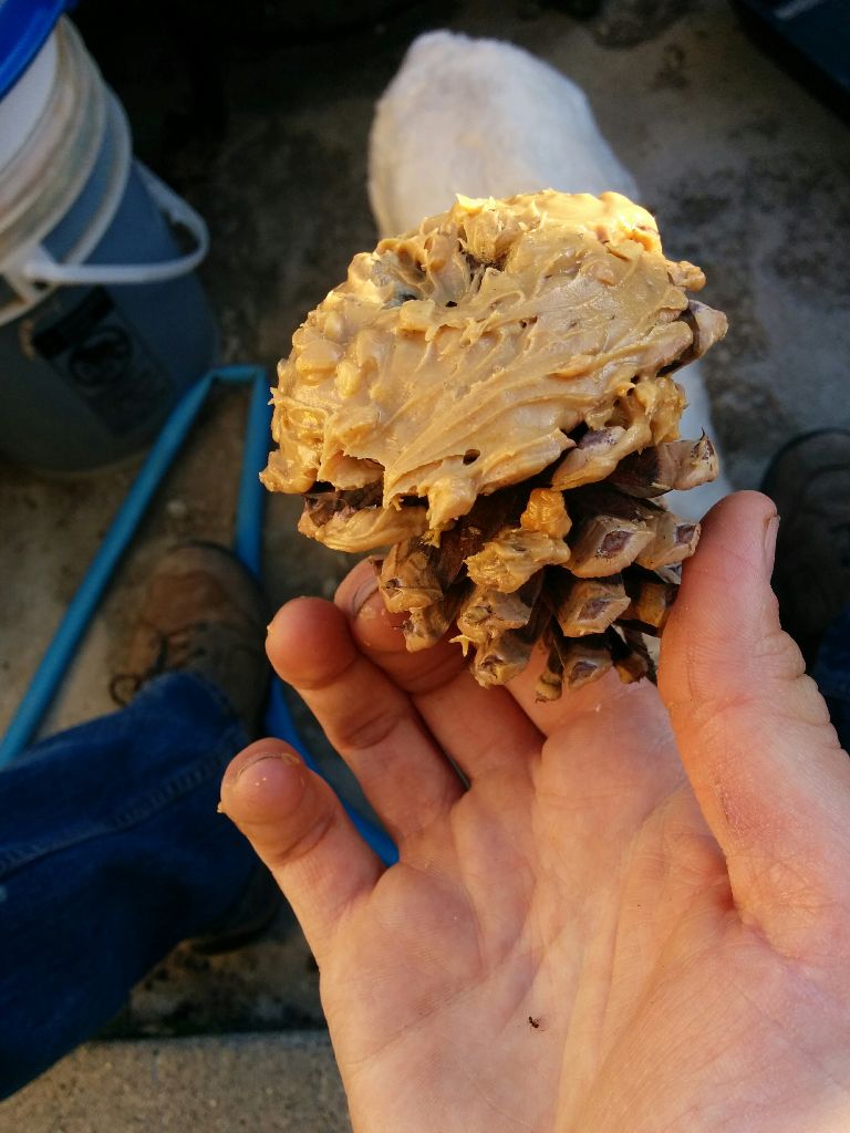 טובלים במזון הציפורים כדי שידבק טוב טוב מסביב לאיצטרובל