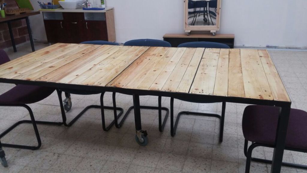 שימו לב: זהו מספר הרגליים הסופי של השולחן. בשלב הזה חתכתי את שתי הרגליים העצמאיות ושמתי במקום אחת ממש במרכז השולחן. בצורה הזאת השולחן שומר על יציבות ובו זמנית יש רגליים רק בפינות. כשהיו רגליים באמצע הן הפריעו לשבת בנוחות כל התלמידים יחדיו.