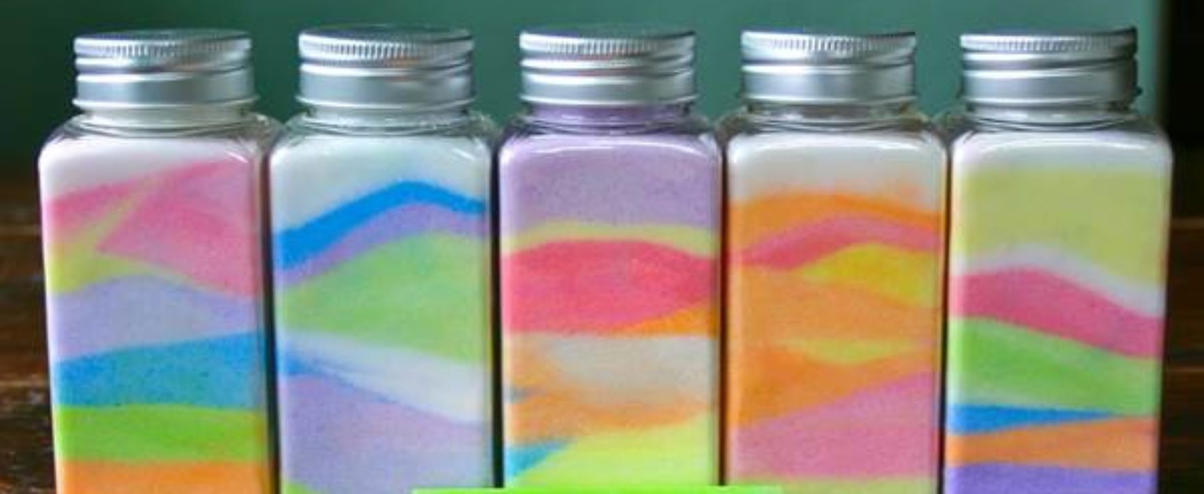 פעילות שהיינו עושים בתור ילדים. המתכון הוא דיי פשוט, כל מה שצריך זה צנצנות זכוכית או בקבוקי זכוכית ריקים, נקיים ויבשים, מלח וגירים צבעוניים. שמים כמות מלח בצלחת עמוקה וצובעים את המלח עם הגירים, כל צלחת בצבע אחר. לאחר מכן שופכים את המלח הצבוע לתוך הבקבוקים או הצנצנות כדי ליצור אפקט יפה ומיוחד. וכל זה בלי שהייתם צריכים לבקש במכתש הקטן :)