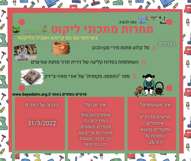 סדנת קליעה של נירית זנדני מתנת “שורשים”. בבקתת בוץ מוקפת בוסתן מתקיימות סדנאות לקליעת סלים בנצרים. מוזמנות/ים לכמה שעות של שקט ושלווה יחד עם חבר או חברה, במושב אביגדור. את המדריך שיזכה בפרס הנהדר הזה תבחר טלאור כהן הלקטית המופלאה של שביל הליקוט. הזוכה הוא המדריך “כדורי אנרגיה עם טוויסט מדליק” של גילעד עמיר.