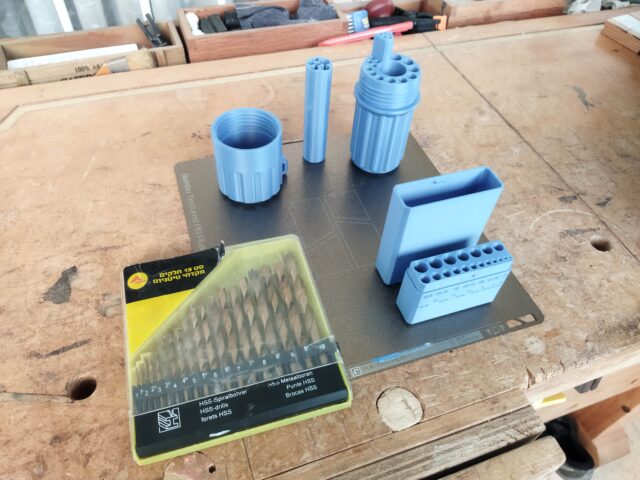 בתמונות הבאות קופסה מפח זיתים, לראשי מקדח שקופסת הפלסטיק המקורית שלהם נשברה, וקופסאות מודפסות לראשי מקדח, שקופסת הפלסטיק המקורית שלהם תקינה לגמרי אבל רחבה מדי לארגז הכלים